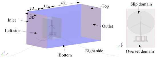 The horizontal axis floating wind turbine is installed in the offshore region, which suffers from complex external load during its lifetime. In order to simulate the motion of the full-scale model under different conditions, the full-scale NREL 5MW FOWT is imported into the CFD platform STAR-CCM+ to establish the calculation domain and divide the mesh. The calculation domain is divided into background domain, overset domain, and slip domain. The calculation domains and their corresponding boundary conditions are shown in Table 4 and Figure 4. The inlet is located in the 2D distance from the wind turbine model, the left and right side is located in the distance 1.5D, and the distance from the wind turbine model to the outlet is 5D. A wave suppression area of 1D is set at the outlet to avoid the influence of wall reflection on the fluid. The boundary conditions are set according to the reference [23,24].