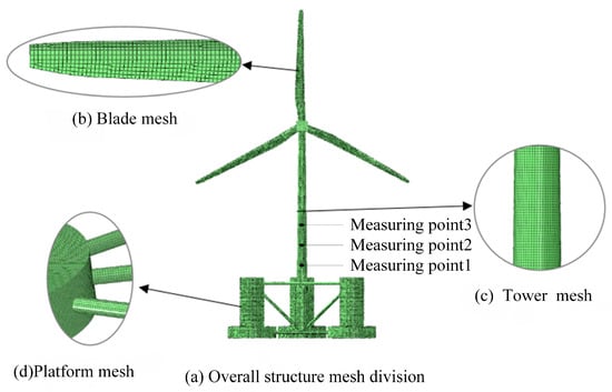 In the CFD-FEA simulation, the structural finite element mesh is set up in the FEA platform. The geometric model of floating wind turbine (including the platform ribs, the stiffener, and the blade web structure) is established in SOLIDWORKS 2022, and then is imported into the mesh division software to complete the mesh division. The mesh and node information are imported into the FEA platform to complete the definition of material parameters and boundary conditions. In order to ensure the correctness of the mesh mapping in the CFD–FEA simulation, the size of the finite element mesh of the structure is similar to that of the hydrodynamic model. The base sizes of the mesh for the blade and the platform are 0.2 m and 0.48 m, respectively. After the division, the total number of mesh cells for the FEA model is 290,000. Figure 5 shows the structural finite element mesh of the floating wind turbine.