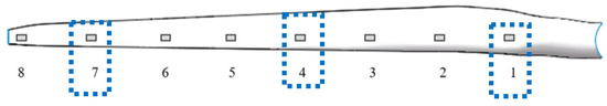 In order to explore the stress and deformation of the blade, eight nodes are arranged equidistantly on the blade, as shown in Figure 6.