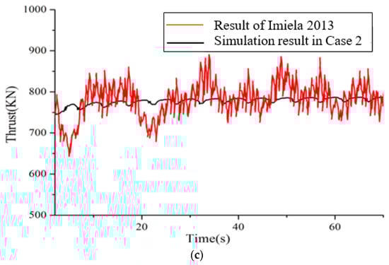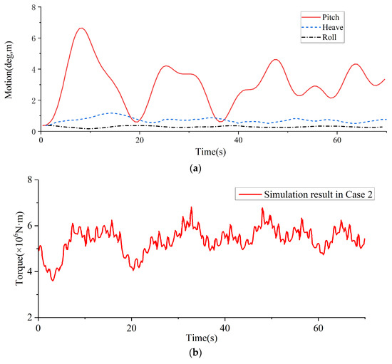 The motion, torque, and thrust of the floating wind turbine in Case 2. (a) The motion of the platform; (b) the time-domain curves of torque of the floating wind turbine; (c) the comparisons between Imiela 2013 [26] and the simulation result of thrust.