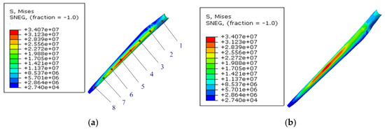 It can be seen from the stress distribution (Figure 10a,b) that the maximum equivalent stress and deformation occur at r/R = 0.2~0.8 from the middle of the blade, regardless of the windward and leeward sides. This is the location where the bending moment is primarily sustained, and the maximum stress reaches 3.4 × 107 Pa. In addition, the circular airfoil at the blade root and the DU40 series transition also exhibit obvious stress, which is caused by excessive changes in geometric curvature in this area.