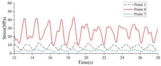 The stress on points 1, 4, and 7 on the blade is analyzed in the time-domain curve (the location of the points is shown in Figure 6). Since the velocity near the waves is different from higher up and the blades pass the tower, the stress on the blades also undergoes periodic changes, as illustrated in Figure 11. The stress value at point 4 shows the most significant change, indicating that this is the location where the primary bending moment is experienced.