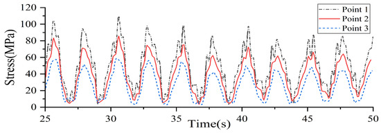 The time-domain curves of the stress of the tower barrel at points 1–3.