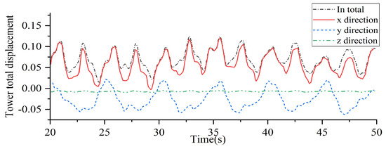 Figure 14 presents the time-history curve of the deformation in the x-, y-, and z-axis directions at the top of the tower. The deformation curve presents regular changes, with the smallest deformation in the z-axis direction. It is mainly reflected in the displacement in the x-axis direction, with the maximum deformation reaching 0.13 m. The maximum stress of the tower is 108.8 MPa, which is lower than the allowable stress of 263 MPa, meeting the strength requirement.