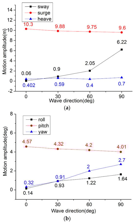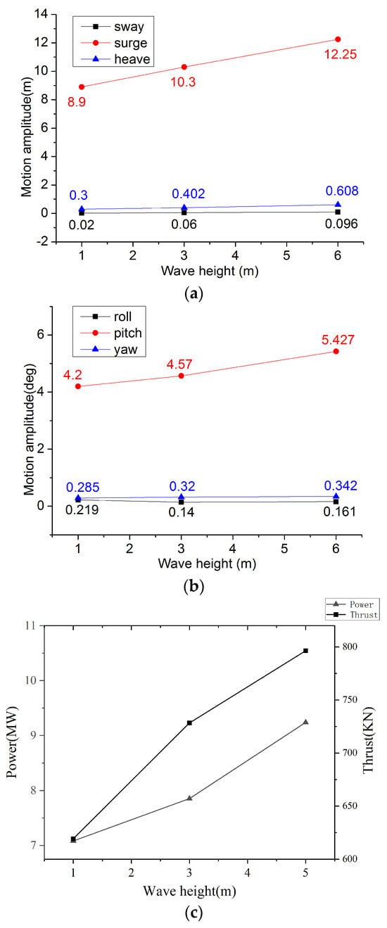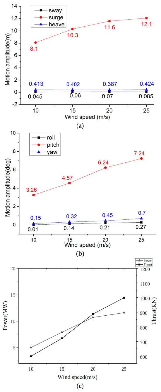 The 6-DOF motion amplitudes of the floating wind turbine under wave height 3 m, wave period 8 s, wave direction 0. (a) The sway, surge, heave of the floating wind turbine; (b) the roll, pitch, yaw of the floating wind turbine; (c) the thrust of the floating wind turbine.
