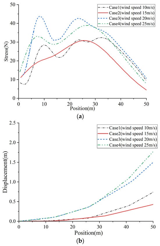 The stress and displacement of the blade along the spanwise direction of Case 1, 2, 3 and 4. (a) The stress of the blade; (b) the displacement of the blade.