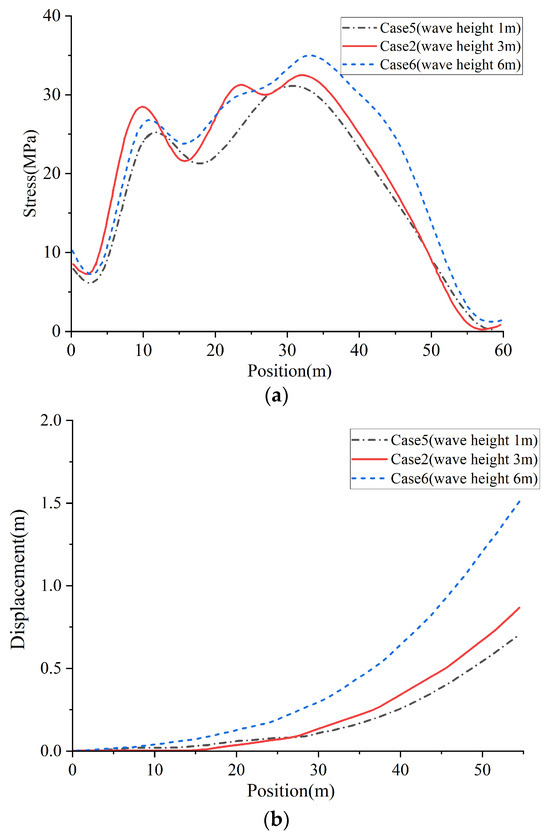Figure 12 presents the time-domain curves of stress of the tower barrel (i.e., at points 1, 2, and 3). Due to the action of waves and wind, as well as the rotation of the three blades, the stress undergoes periodic changes. The tower barrel is a slender and flexible structure. Hence, it will exhibit noticeable structural deformation. As shown in Figure 13, the tower barrel’s displacement increases with height, and the most significant deformation occurs at the top.