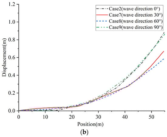 The results of Case 2, Case 7, and Case 8 are analyzed in this section. Figure 19 illustrates the 6-DOF motion and thrust of the floating wind turbine under various wave directions. At 0°, the wave experiences the maximum load in the surging direction. As the wave incidence angle increases, the wave load in the surging direction gradually decreases. Heave motion is almost unchanged, while roll motion is the most sensitive to changes in wave direction. At wave direction 90°, the roll motion is 6.22 m; the yaw angle also reaches 2.7°. It is evident that the change in wave direction significantly affects the lateral movement of the floating wind turbine. Figure 19c illustrates the thrust and output power of the floating wind turbine in varying wave directions. At the same wind speed and wave height, the output power and thrust of the wind turbine do not change significantly. The output power of the floating wind turbine remains stable at 7.6 MW, and the thrust is constant at 720 kN.