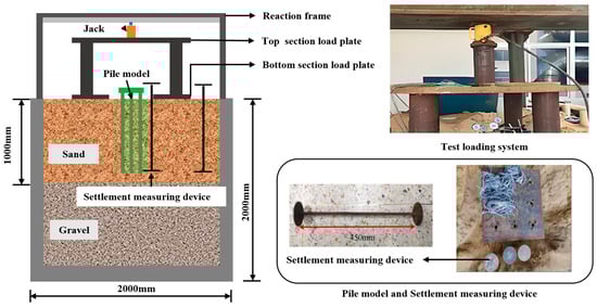 Figure 3, the top load of the test pile was applied using a 2 kg calibration weight for static loading, based on preliminary experiments to determine the pile’s bearing capacity, ultimately establishing a static load of 500 N at the pile top. A 30 mm thick steel plate was placed on the soil surface and uniformly distributed loading was provided using a jack and reaction frame structure, aiming to induce noticeable settlement conditions around the pile. The surface loading of the soil was incrementally applied in five stages up to 100 kPa.