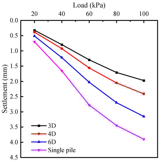 For both single piles and rectangular pile groups across all spacings, pile settlement increases with the applied loading level. Notably, beyond a loading level of 60 kPa, the rate of settlement increase diminishes, which is particularly pronounced in configurations with 3D pile spacing of rectangular groups.