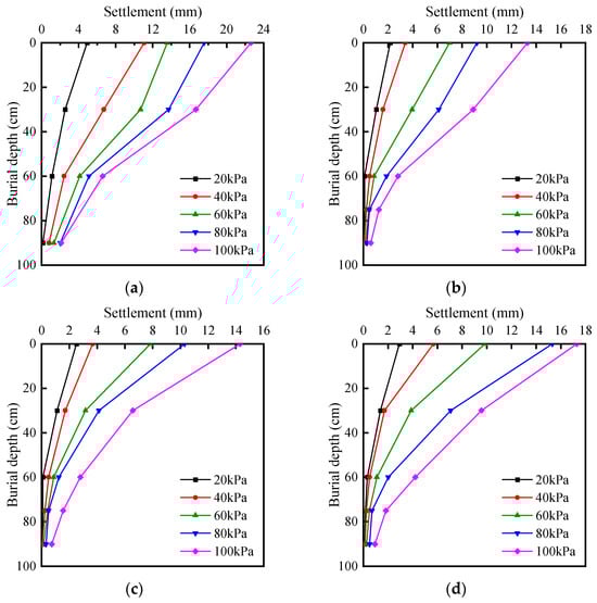 Figure 6a illustrates the relationship between settlement around a single pile and the varying loading levels. It can be observed that the settlement in deeper soil layers due to the load is much smaller compared to that in the surface layers. As the loading level increases, the settlement in the surface layers increases significantly, whereas the settlement in the deeper layers shows a smaller variation. This phenomenon occurs because superficial soil, being closer to the surface, possesses relatively stronger compressibility and deformability. In contrast, deeper soil, constrained by the superficial layers, experiences reduced compressibility and deformability, thus resulting in relatively smaller settlement.