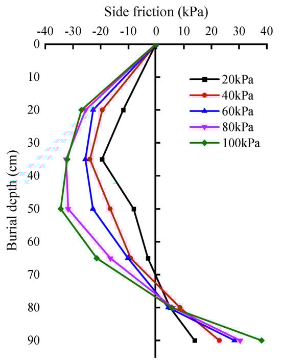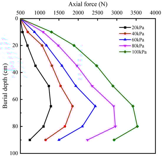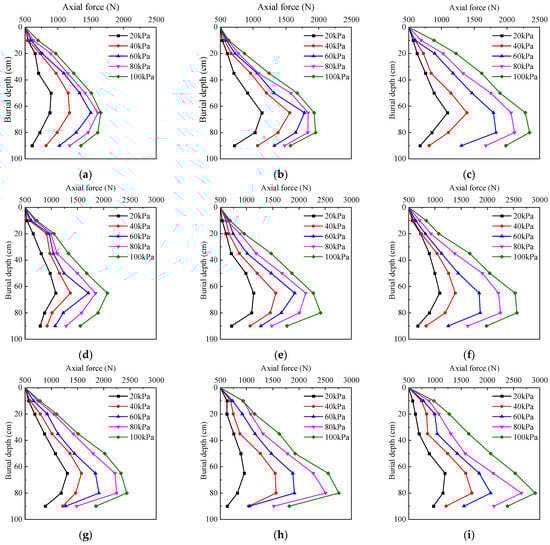 Figure 7, it is evident that the axial force relationship of a single pile increases with the applied loading level. At different loading levels, the maximum axial forces for the single pile are 791 N, 1453.2 N, 2143.7 N, 2662.6 N, and 3531.1 N. The maximum axial force occurs at a loading level of 100 kPa, exhibiting a distinct pattern of initial increase followed by subsequent decrease along the length of the pile shaft. Under the same loading level, as the embedment depth increases, the axial force initially rises, but the rate of increase gradually diminishes until it begins to decrease. This phenomenon occurs because the settlement induced in the shallow soil layers is greater compared to that in the pile, causing an increase in downward frictional forces on the pile and thereby increasing the axial force. However, as the depth increases, the difference between soil settlement and pile settlement decreases gradually. Eventually, when their displacements become equal, the pile settlement exceeds that of the soil. At this point, the pile begins to experience positive skin friction, leading to a reduction in axial force.