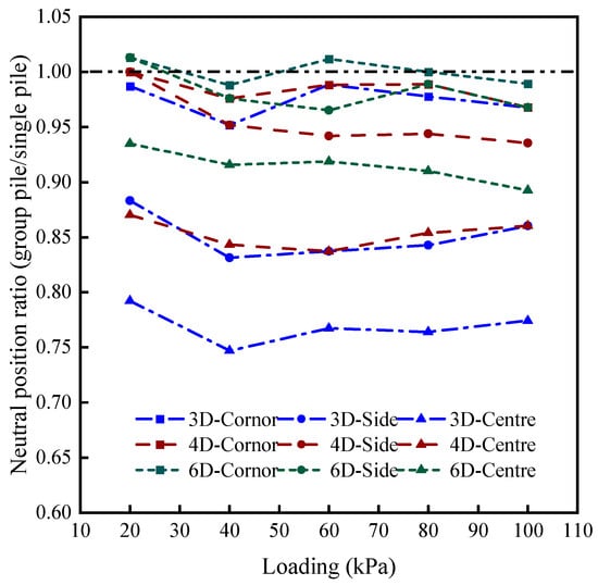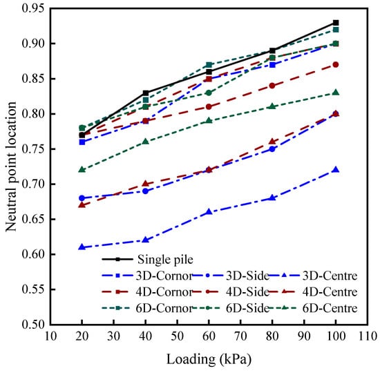 Figure 11, it can be seen that under the same loading level, the neutral point position ratio for corner piles is greater than that for side piles, which in turn is greater than that for center piles. This is because center piles are influenced by the superposition of adjacent multiple piles. Compared to center and side piles, corner piles are adjacent to the fewest number of piles and thus experience the least influence from pile group effects.