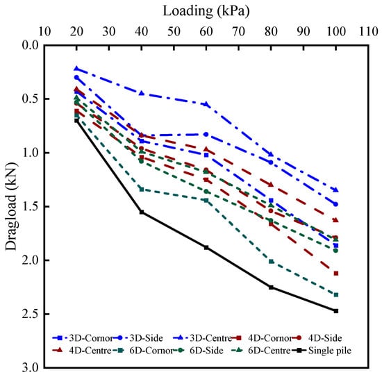 Figure 12 presents the dragload of a 3 × 3 rectangular pile group at varying pile spacings under different loading conditions. It is evident that as the applied load increases, the dragload for all pile groups, regardless of spacing, follows a trend akin to that of a single isolated pile—rising proportionally with the load magnitude. However, as the loading levels escalate, the rate of dragload increment diminishes.