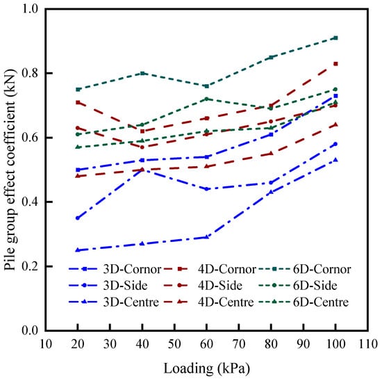 Figure 13 shows the pile group effect coefficients for 3 × 3 rectangular pile groups at different pile spacings and under varying loading levels. It can be observed that for the same loading level, smaller pile spacings result in smaller pile group effect coefficients. Additionally, within the same pile spacing, the central piles exhibit the smallest pile group effect coefficient, followed by the edge piles, and the corner piles show the largest coefficient. As the loading level increases, the pile group effect coefficients for all pile spacings generally increase.