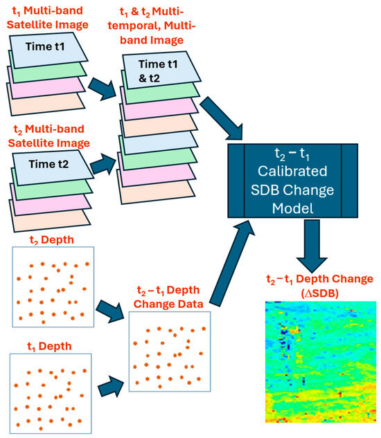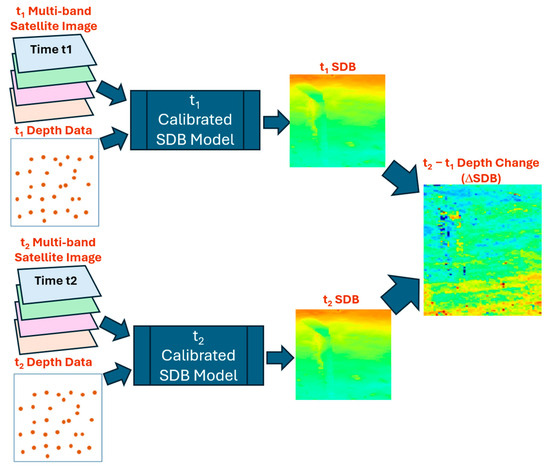 The use of LiDAR data to estimate near-shore depth change has been previously recognized—e.g., [23,24,25]. Hence, a number of researchers have begun to turn their attention to SDB for depth change [26,27,28,29]. The empirical approach that has been explored is diagrammed in Figure 1. It comprises the following steps: