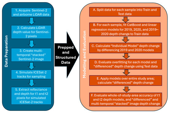 Pre- and post-hurricane cloud-free Sentinel-2 images were acquired on 21 March 2019 and 19 April 2021, respectively, from the European Space Agency [30] (Box 1, Figure 3). These were atmospherically corrected using ACOLITE [31]. Pre- and post-hurricane airborne LiDAR data were downloaded using the National Oceanographic and Atmospheric Administration’s (NOAA’s) Digital Coast Data Access Viewer [32]. The pre-hurricane reference airborne LiDAR data had been acquired between 27 October 2018 and 20 November 2018 using the green laser (532 nm) of the Teledyne Optech CZMIL (Coastal Zone Mapping and Imaging LiDAR) manufactured by, and sourced from Teledyne Optech (Toronto, ON, Canada). The post-hurricane reference airborne LiDAR data were collected between 22 September 2020 and 13 October 2020 as part of the National Coastal Mapping Program (NCMP) rapid response [33]. Both data sets had been post-processed by the NCMP into digital depth models (DDMs) comprising 1 m pixels using a triangulated irregular network (TIN) approach. For the present work, pre- and post-hurricane depths for each Sentinel-2 pixel were determined by overlaying the 10 m Sentinel-2 pixels on the 1 m DDM and extracting the median DDM value for each Sentinel-2 pixel (Box 2, Figure 3). These values are treated as the reference/“true” depths in this study. Reference/“true” depth change was determined by differencing the values for each pixel with positive values indicating accretion (a decrease in depth) and negative values indicating erosion (an increase in depth) from 2019 to 2020. (Because reference LiDAR data were acquired in 2019 and 2020, the depth change modelled is referred to as “2019 to 2020” despite the reality that the Sentinal-2 images were acquired in 2019 and 2021).