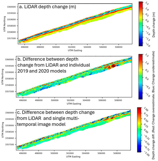 Such general statements, of course, are not spatially explicit. However, the spatial distribution of the uncertainty could be assessed by examining information such as was presented in the Figure 8 example; such graphics were produced (but not presented here for article brevity) for all samples, band combinations, and modelling types. In Figure 8, there is an area (red area in the northeast of Figure 8b) of depth change overestimation resulting from the use of CatBoost in the individual model differencing approach while the multi-temporal “stacked” image approach to depth change estimation (Figure 8c) shows no such anomaly. If it were of interest, comparable results for each sample type, band combination, and modelling type could also be examined.