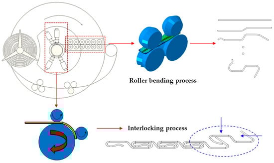 Manufacturing of the carcass layer is accomplished through an entire production line, which includes the core carcass layer interlocking machine and several pieces of auxiliary equipment, such as traction devices, wire racks, winding racks and spools. However, the core technology for the formation of the carcass layer is concentrated in the interlocking machine. A schematic diagram of the front panel of the carcass layer interlocking machine is shown in Figure 2. It can be observed that the cold bending forming process of the carcass layer can be broadly divided into two steps: