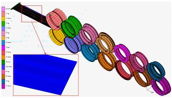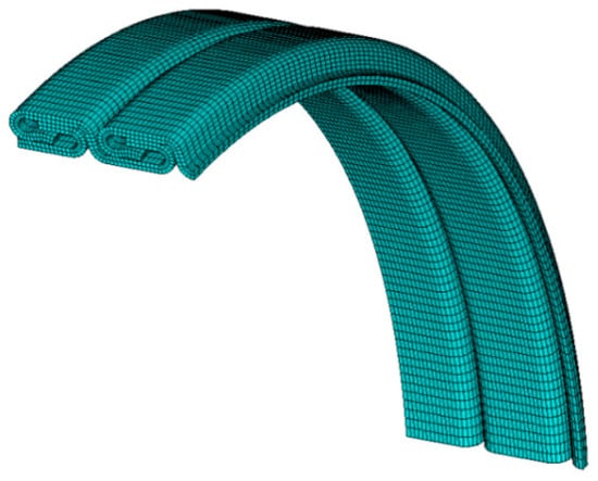 Mesh partitioning is a crucial technique in finite element methods to accurately analyze and predict the deformation and stress during the cold forming process of carcass layers. An excessively coarse mesh directly impacts the accuracy of computational results, while an overly fine mesh significantly decreases computational efficiency. Therefore, the model employs mesh refinement in regions where cold bending deformation occurs based on the shape of the carcass layer, while areas where no cold bending deformation occurs have larger mesh sizes. The distribution of elements along the axial direction of the strip remains consistent, resulting in a total of 6208 elements in the strip model. Detailed mesh partitioning of the strip and finite element model for roller bending can be found in Figure 5.