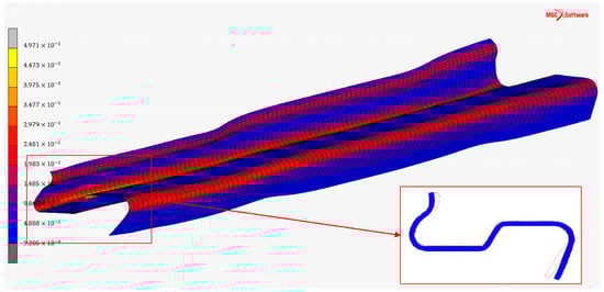 The distribution of equivalent plastic strain in the steel strip during the roller bending process is shown in Figure 6. It can be seen that significant plastic deformation occurs at the bends of the steel strip, while the straight sections exhibit almost no plastic strain. As the rollers drive the steel strip, the extent of plastic deformation gradually increases, and the transition is smooth, with no irregular forming responses of the local buckling or waves observed in the simulation process. After passing through the last set of rollers, the equivalent plastic strain in the steel strip reaches 35%. Due to spring-back deformation, the final formed profile of the steel strip shows a slight difference at the transverse ends compared to the shape of the last set of rollers. It can also be observed that a reduction in thickness occurs at the bend regions of the steel strip, which is due to the material’s Poisson effect.