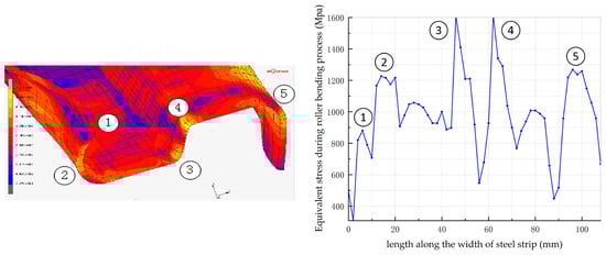 The equivalent stress distribution along the width of the steel strip during the roller bending process was obtained by using the post-processing module, as illustrated in Figure 7. It can be clearly observed that there are stress peaks at the five bend corners, with the most prominent stress extremes at the inner bend corners (positions 3 and 4). Consequently, significant residual stress emerges at the bend corners once the load is removed. Thus, in the roller bending stage of the carcass layer, residual stresses at the inner bend corners are extracted.