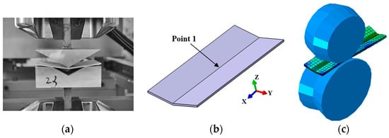 Cold bending test of steel strip and corresponding finite element model: (a) testing device; (b) marked point; and (c) model of one set of rollers.