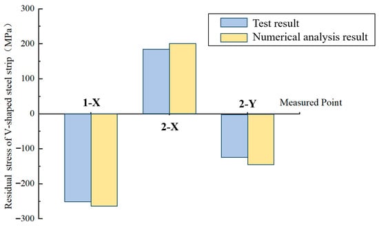 In order to validate the cold bending finite element model, a comparative analysis is conducted between the results of the cold bending test conducted on steel strips in reference [14] and the results from the numerical model proposed in this study. This experiment is conducted on a steel strip with a thickness of 2.3 mm, which was subjected to cold bending hardening with a V-shaped rigid contact surface (Figure 8a). The residual stress values at the marked points shown in Figure 8b were measured (point 1 represents the point in the inner bending surface, point 2 represents the point in the corresponding outer bending surface and X and Y indicate the stress direction). Using the numerical methods introduced in this section, one set of roller models with V-shaped contact surfaces is established (Figure 8c), and an analysis of the deformation of the steel strip model due to driving the roller wheels is conducted. The calculated values of the residual stresses on the inner and outer surfaces at the marked points are compared with the measured results, as shown in Figure 9, and the two are in good agreement, thus verifying the correctness of the proposed finite element model.