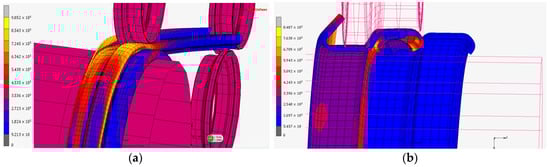 The equivalent stress contour of the steel strip in the interlocking stage: (a) at the first set of radial pressure rollers; (b) at the last set of radial pressure rollers.