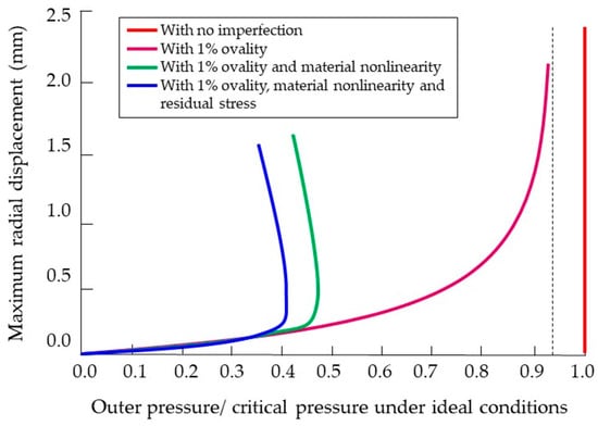 The buckling behavior of the carcass layer is calculated considering three types of imperfections, namely, geometric ovality, material nonlinearity and residual stresses from the deformation process, and compared with the results under ideal conditions, as shown in Figure 14. The transverse axis is the ratio of the applied external pressure to the first-order buckling eigenvalue of the carcass layer under ideal conditions, and the longitudinal axis represents the maximum radial displacement of the carcass layer. These indicate that the nonlinear buckling behavior of the carcass layer caused by different imperfections is different. As the imperfection increases, the critical pressure of the carcass layer gradually decreases. The quantitative impact of various imperfections on the critical pressure of the carcass layer structure is detailed in Table 1. It can be seen that when all the imperfections are considered simultaneously, the critical pressure of the carcass layer decreases by approximately 60% compared to the ideal results.