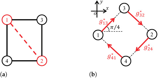 The position coordinate vector of the swarm is denoted by , where is the position coordinate vector of leader vehicles with , and symbolizes the position coordinate vector of follower vehicles with . For a formation , the replacement of from vehicle i with j satisfies . The relative bearing of vehicle j to vehicle i is defined as .