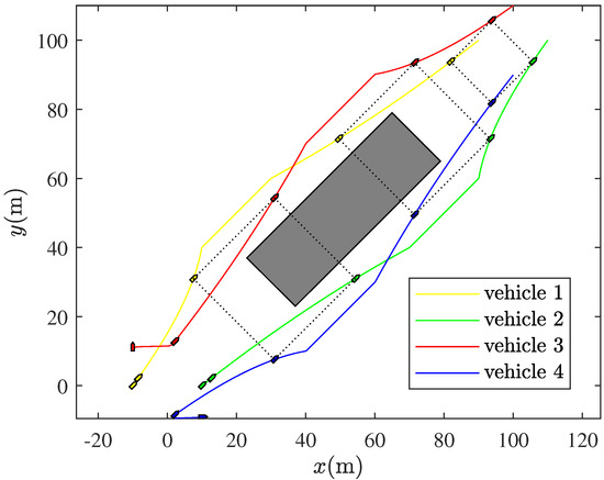 According to Figure 2, there are mainly two kinds of method parameters in the proposed formation control algorithm: one is the number of followers and the other one is the dimension of follower vehicles. It can be determined from the detailed flow chart in Figure 2 that the computational complexity of the algorithm is proportional to the product of these two types of method parameters, which can be quantitatively expressed as , where is the number of method parameters in the proposed algorithm, representing the data size of this algorithm.