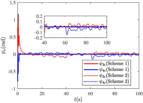 where , , . In the control law (26), all of the model parameters are required, such as inertia coefficients, centripetal and Coriolis coefficients and hydrodynamic damping coefficients. In comparative simulations, we select control parameters for the follower vehicles as below. In Scheme 1 and Scheme 2, the same common parameters are chosen, i.e., , , , , , . For Scheme 1, we choose , , , , .