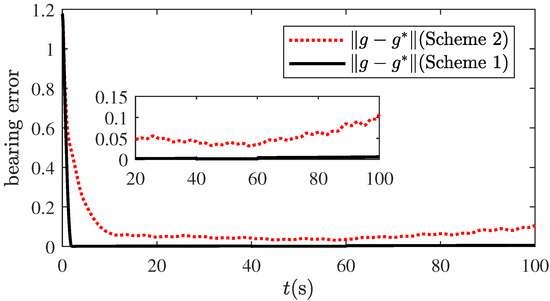 First, adopt the fault settings in Case 1. The formation scaling control performance of the developed concise fault-tolerant control scheme (marked as Scheme 1 later) is compared with a model-based scheme (marked as Scheme 2), where the model-based formation scaling control law is given by