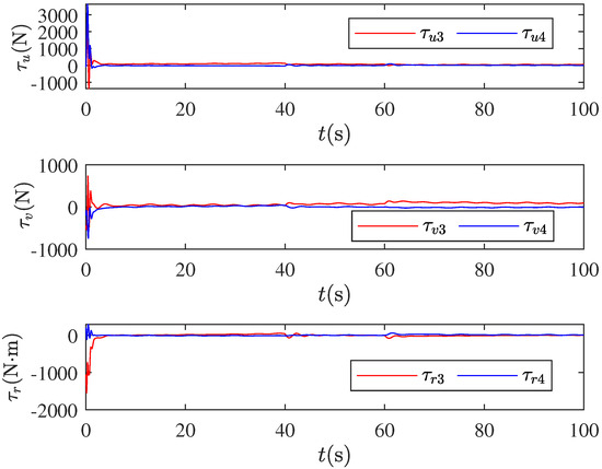 To demonstrate the adaptability of the proposed formation control scheme, the faults of the follower vehicles are set in three different cases. These fault settings are given in Table 2. In Case 1, there is no fault in three control channels initially; then, faults are gradually generated; finally, a 50% actuator efficiency reduction in surge and sway channel and a 60% actuator efficiency reduction in yaw channel are encountered. In Case 2, an 80% actuator efficiency reduction in surge and sway channel and a 90% actuator efficiency reduction in yaw channel are faced initially; then, faults gradually disappear in all the control channels. In Case 3, an 80% actuator efficiency reduction in surge and sway channel and a 90% actuator efficiency reduction in yaw channel are encountered initially; then, faults gradually become worse; finally, a 90% actuator efficiency reduction in surge and sway channel and a 95% actuator efficiency reduction in yaw channel are faced. In all of the above cases, actuator biases are set to be the same, which are relatively small.