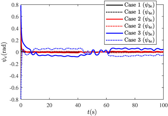 Next, we test the adaptive fault-tolerant formation performance of Scheme 1 using the fault settings from Cases 1 to 3. We choose the same control parameters in these three different cases. The simulation results are presented in Figure 9 and Figure 10. It can be observed that in all the fault cases, desired formation translational and scaling maneuvers can be obtained by means of Scheme 1. As the faults worsen, the yaw angle tracking errors and bearing errors gradually increase, which conforms to the main results in Section 4. It is worth mentioning that good fault-tolerant performances in Cases 2 and 3 show that the proposed adaptive fault-tolerant control scheme is able to handle sudden and severe faults under Assumptions 2 and 3; that is, the proposed scheme has the ability to adapt and maintain formation integrity in such scenarios.