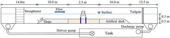 To obtain the equilibrium scour hole topography around jacket foundations under steady flow, physical model tests were conducted. Figure 1 shows the experimental flume used in this study, which is 50 m long, 1 m wide, and 1.5 m high. A 2.5 m long, 1 m wide, and 0.3 m deep sand recess was designed at the middle section of the flume, 24 m from the flume inlet. The model was positioned at the center of the sand recess, with 0.34 m from the pile to the flume wall. A concrete slope with a degree of 1:10 and a height of 0.3 meters was placed 14 m from the flume inlet to ensure smooth water flow transition. An acoustic Doppler velocimetry (ADV) was deployed to measure the velocity distributions at various locations within the flume. After the experiments were completed, the output data from the ADV were filtered using WinADV software, V2.024,the United States [15]. Data with low correlation (minimum COR < 70) were removed. Figure 2 shows the schematic diagram of the jacket foundation model, and Table 1 lists the dimensions of the model components. The pile diameter (D) was 0.04 m, the spacing between piles was 0.24 m, and the water depth above the artificial deck was 0.3 m.