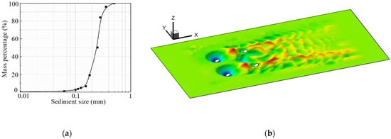 Once the scour reached equilibrium, the flume was slowly drained, and the topography of the equilibrium scour hole was scanned for numerical modeling. Approximately 150 photos of the sand bed around the jacket foundation model were taken from different angles and levels after each test. These photos were then used to establish a three-dimensional numerical model. For ease of scanning, the jacket foundation could be disassembled into an upper truss structure and piles. In this study, the clear spacing between the piles of the jacket foundation was six times the pile diameter, with the equivalent diameter-to-flume width ratio being 8%, which essentially negates the influence of boundary effects [16]. Figure 3a shows the particle size distribution of the sand used in the experiment. The sand used in the experiment had a median particle size (d50) of 0.25 mm, a geometric standard deviation of 1.49, a measured void ratio of 0.47, and a relative weight of 2.65. Based on previous studies, the critical sediment initiation velocity in the experiment was calculated to be 0.231 m/s [17]. The average flow velocity, which was 0.9 times this critical velocity, was used in this study to ensure a clear water scour condition. Only clear-scour conditions were considered in this study, and no sand was involved in the water motion. The equilibrium scour topography obtained from the experiment is shown in Figure 3b.