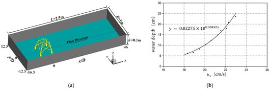 The origin of the coordinate system in the numerical model is set at the center of the jacket foundation at the original bed level. The x-axis is aligned with the flow direction, the y-axis is transverse to the flume, and the z-axis is vertical. As shown in Figure 4a, the computational domain has a length (L) of 2.5 m, a width (B) of 1 m (equal to the width of the flume), and a height of 0.3 m, which corresponds to the water depth (h). The diameter of the jacket foundation piles is D, and the gaps between the piles are 7D.