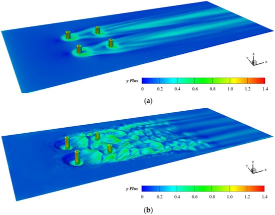 Figure 5 shows the distribution of y+ around the jacket foundation on flat-bed and equilibrium scour bathymetry, respectively. It can be observed that y+ values are all less than 1.5, indicating that the first-layer boundary layer mesh thickness used in this study meets the accuracy requirements of LES.