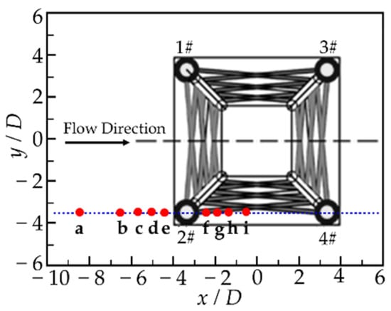 We selected the cross-section along the centerline of the front and rear rows of piles in the jacket foundation as the characteristic section (y/D = 3.5) for analysis. The blank areas in the section represent the pile structures, with the corresponding pile numbers attached. The water flow direction is from left to right. The pile diameter (D) was used as the basis for the non-dimensional distance parameter.