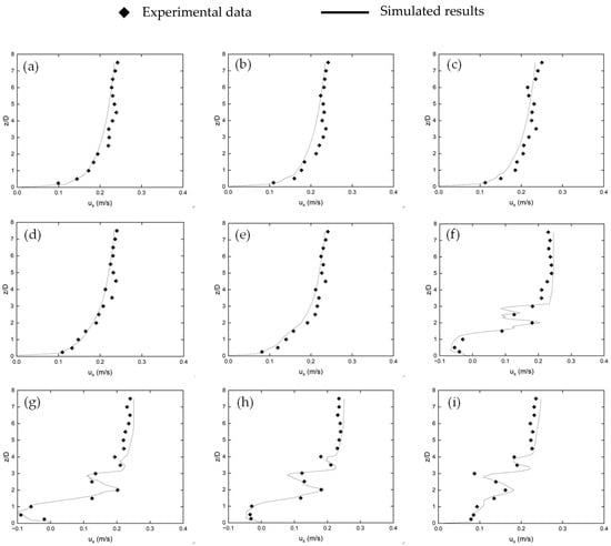 Comparison of time-averaged horizontal velocities between simulated results of the jacket foundation and experimental measurements: (a) x/D = −8.5; (b) x/D = −6.5; (c) x/D = −5.5; (d) x/D = −5; (e) x/D = −4.5; (f) x/D = −2.5; (g) x/D = −2; (h) x/D = −1.5; (i) x/D = −0.5.