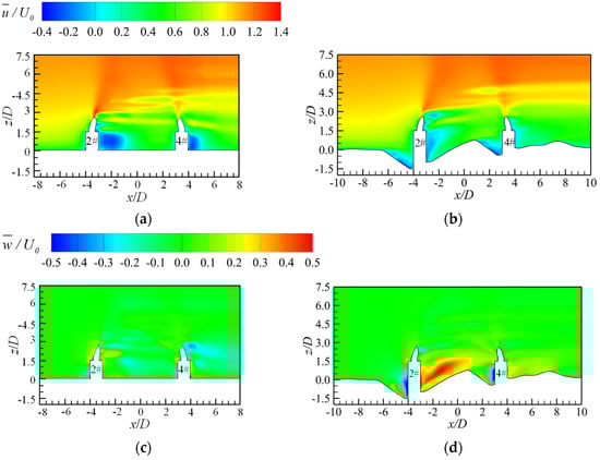 Non-dimensional time-averaged velocity distribution at the characteristic cross-section: (a) horizontal velocity in the flat-bed state; (b) horizontal velocity in the equilibrium state; (c) vertical velocity in the flat-bed state; (d) vertical velocity in the equilibrium state.