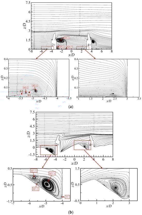Figure 9 shows the distribution of two-dimensional time-averaged streamlines on the characteristic cross-section (y/D = 3.5) of the jacket foundation in the flat-bed and equilibrium scour states. As shown in Figure 8a, two horseshoe vortices (HSVs), HV1 and HV2, develop upstream of the front pile. HV1 is located 1D upstream of the front pile, with the vortex core at (−4.85D, 0.06D). A smaller secondary vortex, HV2, develops upstream of HV1, with its core at (−5.30D, 0.04D). Additionally, a saddle point, S1, can be observed between HV1 and HV2. Another saddle point, S2, is present upstream of HV2. The upstream side of the rear piles also exhibits the aforementioned flow field structure, though with a relatively smaller range due to the shielding effect of the front piles.