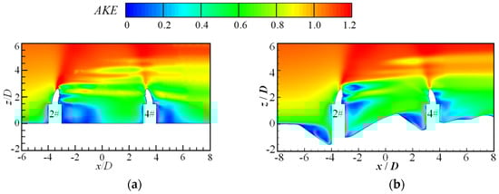 Figure 10 shows the distribution of average kinetic energy (AKE) at the characteristic cross-section of the jacket foundation on flat-bed and equilibrium scour bathymetry. It can be seen that as the flow approaches the front pile, the AKE gradually decreases in both cases. Additionally, due to the contraction of the flow cross-section within the upper truss structure, the flow around the truss structure experiences a sharp increase in AKE in both the flat-bed and equilibrium states. However, Figure 10a shows that the low AKE in the flat-bed state occurs mainly downstream of the piles. In contrast, Figure 10b shows that the low AKE in the equilibrium state occurs at the interface between the truss structure and the piles, as well as on the upstream slope of the scour holes around both the front and rear piles. The different locations of low AKE in the flat-bed and equilibrium states may result from the existence of scour hole and the upflow from the scour hole, which increases the AKE downstream of the piles.