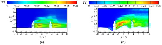 Previous studies have indicated that the flow passing over the foundation increases turbulence intensity downstream [23]. Turbulence intensity is a primary parameter for quantifying turbulence, derived from the average kinetic energy of turbulent eddies [24]. The dimensionless formula for turbulence intensity is as follows: