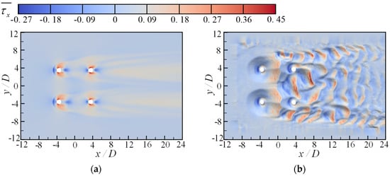 The distribution of bed shear stress is closely related to the vortex characteristics around the foundation. Figure 13 illustrates the average x-direction bed shear stress distribution around the jacket foundations in the flat-bed and equilibrium states, with a critical bed shear stress of 0.18 Pa [25,26]. As shown in Figure 13a, in the flat-bed conditions, a fan-shaped distribution of negative shear stress appears on the upstream side of each pile, with a maximum value of up to 1.2 . As the flow passes the piles, it is compressed on both sides, generating higher positive shear stress at 60° positions on either side of the piles, where local scour first occurs. Comparing the maximum positive shear stress on either side of each pile reveals that the stress on the side closer to the central axis is slightly higher than that on the outer side. This Is due to the combined effects of accelerated flow between the jacket foundation piles and disturbances caused by the truss. Negative shear stress also appears behind each pile due to recirculation. The rear piles experience a shielding effect from the front piles, resulting in smaller ranges of both positive and negative shear stress compared to the front piles, which significantly reduces the initial scour depth around the rear piles.