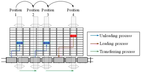 In recent years, China has witnessed a notable trend toward the automation of container terminals, with ports like Xiamen, Tianjin, and Shanghai undergoing transformations or new constructions to adopt automated systems [1]. The investment in automated container terminals (ACTs) has significantly improved the operational efficiency of ports. However, other logistic aspects of the port also need improvement, such as the port collection and distribution links. Road and railway transportation are the main methods of port collection and distribution. With the advantages of large cargo volume, fast transport speed, and independence from climate conditions, railway transportation can effectively improve the efficiency of port cargo collection and distribution. The railway yard is used to connect railway transport with shipping. Some ports have even implemented railway lines directly into ports, elevating the efficiency of sea–rail combined transport. Consequently, it is necessary to improve railway yard operations to increase the operational efficiency of container terminals. Nevertheless, there remains room for improvement in combined sea–land container transport infrastructure, transportation organization modes, and scheduling optimization levels.