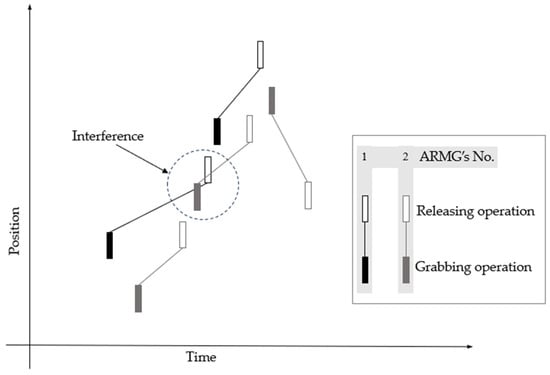 Because the OD positions of the tasks are generally different, the ARMG needs to perform vertical operations at two block bays when handling a task. According to the OD position of the task and the task assignment for the ARMG, the set of interference tasks of the adjacent ARMG can be determined. Figure 3 shows the interference between the ARMGs for handling two tasks, and the position (origin position or destination position) of the interference can also be determined. Referring to the computing method proposed in the literature [16], the minimum interval time for avoiding interference can be computed in advance.