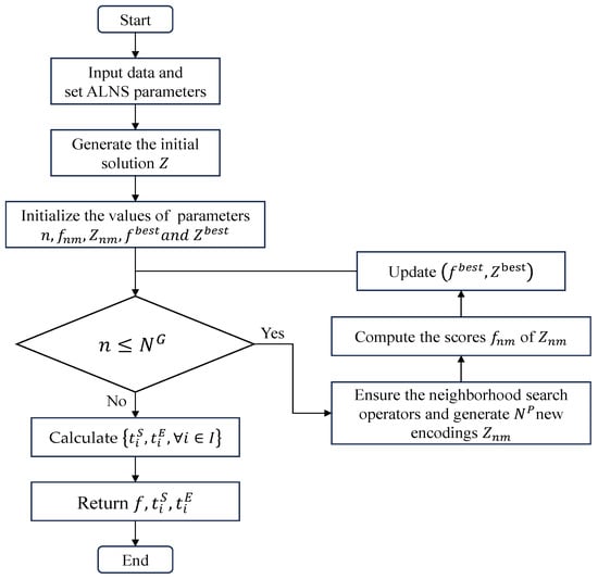 Small-scale examples of MILP models can be solved using the solver CPLEX. To improve efficiency, intelligent algorithms are needed to solve the medium- and large-scale examples. The adaptive large neighborhood search (ALNS) algorithm was first proposed by Ropke and Pisinger in 2006 to solve the pickup and delivery problem with time windows [35] and has since been successfully applied to VRP and its variants [36,37,38]. Zhang et al. [39] and Zhang et al. [40] applied ALNS to solve preference-based multi-objective optimization and planning problems for synchromodal transport. Wang et al. [41] compared CPLEX and ALNS solution results for a tugboat scheduling problem. Chen and Liu [34] demonstrated the feasibility and effectiveness of ALNS in tackling medium- to large-scale instances of the “RYACT–train” cooperative optimization problem. This study also applied an ALNS algorithm to solve the problem. The technical parameters of ARMGs and the initial parameter settings of ALNS are the same as in [34]. The steps of the ALNS algorithm are outlined in Algorithm 1. A flowchart of the proposed ALNS algorithm is shown in Figure 4.